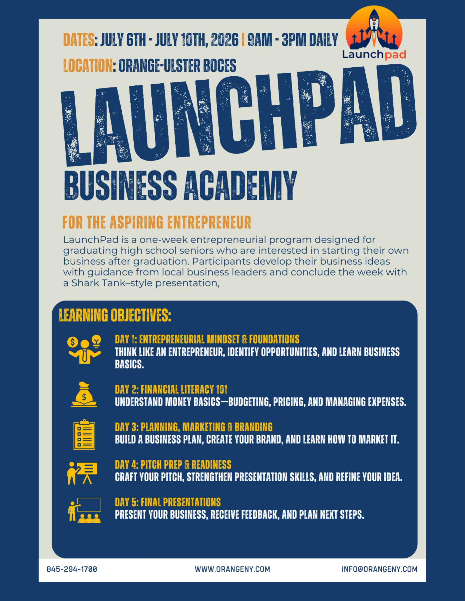 DESCRIPTION:LaunchPad Business Academy   Built for Aspiring Entrepreneurs!\nReady to turn your business idea into reality? LaunchPad is an immersive one-week program designed specifically for high school seniors who are eager to start their own business after graduation.* Work alongside local business leaders\n* Develop and refine your business idea\n* Pitch your concept in a Shark Tank style presentation\nProgram Fee: $225Spots are limited - don't miss your chance to launch your future!👉 Click HERE to fill out the application!
